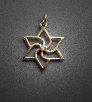 14K yellow gold pinwheel Star of David with a single full cut diamond at the center. Made in Israel.