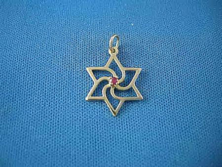 14K yellow gold pinwheel Star of David set with a single full cut ruby in the center. Made in Israel.