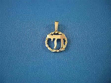 Rope encircled highly polished classic Chai. Executed in 14K yellow gold. Made in the USA. From the House of Raasche Collection.